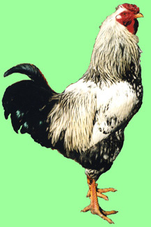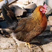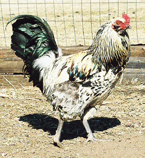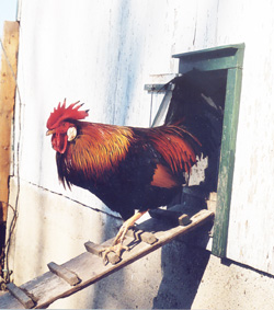 Hen shown at left, and rooster at right are Single-comb Brown Leghorns. Because we raise chickens on a small scale, we like to keep 'heritage' or unusual breeds. Our hens produce eggs just as well as the usual 'production' breeds.. they just look prettier to us! Our 'Foghorn', right, is just about as handsome a rooster as you can find.