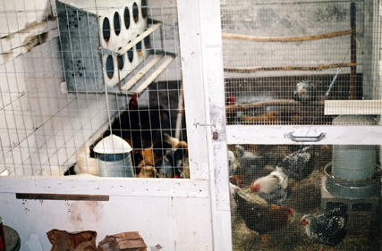 A view of our winter quarters for the chickens, inside the barn. The coop area is double-walled, and has two windows. Their water is heated when the temperature drops below 40 degrees, and they are fed an 18% protein layer ration supplemented by scratch grain and hay in the winter. In the summer their diet is mainly grass, insects, and layer ration. We use no antibiotics, and keep our flock healthy by giving them clean, roomy quarters and plenty of light and air.
