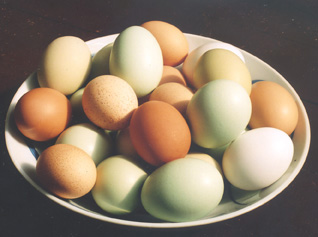Aracaunas or Americaunas lay eggs that range from blue to green in color. The other breeds lay brown or speckled eggs. Not only do our free-range eggs taste better than 'store-bought', they're very pretty!
