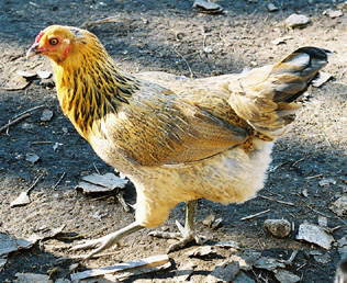 Our bantams are Buff Brahman crossbreds. Gorgeous George, the rooster shown at left, is the ruler of the chicken yard, even with his small stature! He takes no disrespect from even our Wyandotte rooster, shown at top; who outweighs George by about five pounds, Our bantam hens are in charge of hatching eggs.