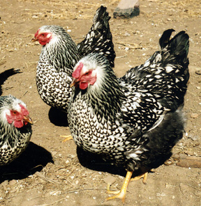Our chickens are raised mainly for eggs; but also for entertainment and the occasional free-range chicken dinner. Our chickens get the run of all the pastures when the weather is good, and in the winter months the vegetable garden becomes their playpen and run. They have either a range house or their own corner of the barn to lay their eggs, and retire to at sunset; then we shut them in until morning to keep them safe from predators.